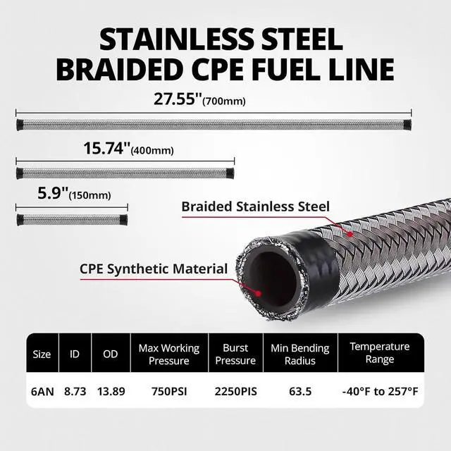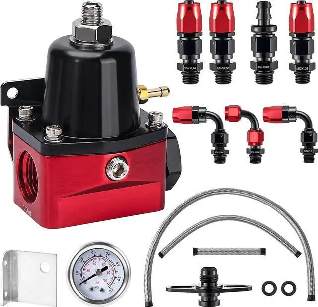 [Package Includes] 1 x fuel pressure regulator, 1 x pressure gauge, 1 x Bracket, 2 x AN6 port plug, 4 x 6AN to 6AN ORB fitting, 1 x 6AN ORB to 6AN Barb fittings, 1 x 6AN to M12* 1.25 fittings, 1 x 6AN to M14* 1.5 fittings, 3 x 6AN Stainless Steel Braided CPE Fuel Line.