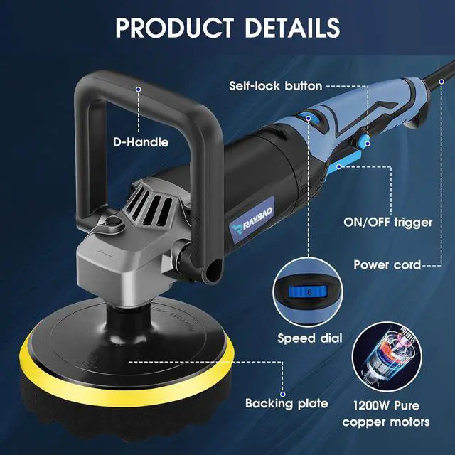 All the accessoriesThis car buffer kit includes an Rotary Polisher; 1*D-Handle; 1*Side-Handle; 1* Hex Wrench; 2*Hexagon socket screws (M8*16); 2* Carbon Brushes; 1* 6-Inch hook loop Backing Plate; 1* 7-Inch hook loop Backing Plate; 1* 7-inch Wool Polishing pads; 1* 7-inch (180mm) Flat Foam Polishing pad; 2* 6-inch (150mm) Wave Foam Polishing pad; 2*150mm Microfiber polishing bonnet; 2*Microfiber Towels; 5*Sandpaper Pad
