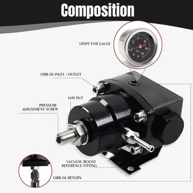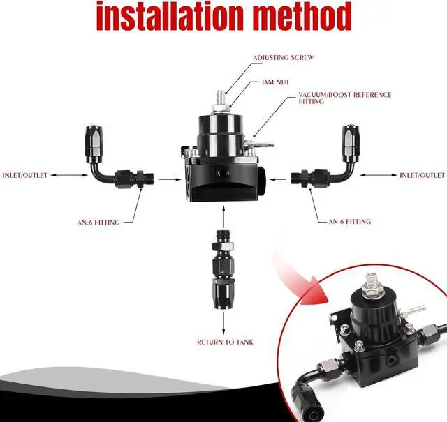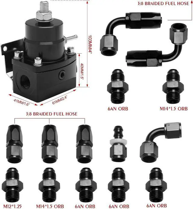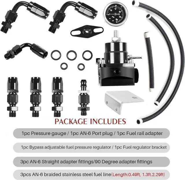 [Package]: Includes 1xfuel pressure regulator, 1xpressure gauge, 1x6an port plug, 3x6an straight adapters, 3x6an 90-degree adapters, 1xfuel rail adapter, 1xfuel regulator bracket, 3x6an fuel line.