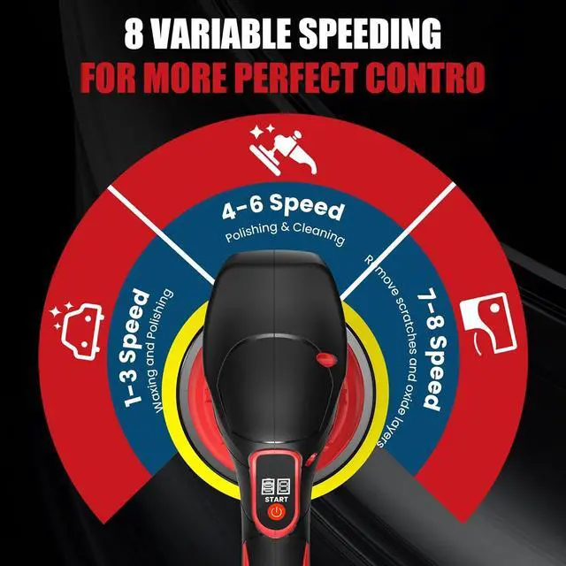 Variable Speed: Our electric car polisher features 8-speed adjustments, ranging from 2000 to 4500 RPM, ensures that it can meet your needs whether you're dealing with delicate surfaces or demanding correction tasks. The low speed is suitable for waxing and buffing, the medium speed for polishing and cleaning, and the high speed for removing paint defects and oxidation.