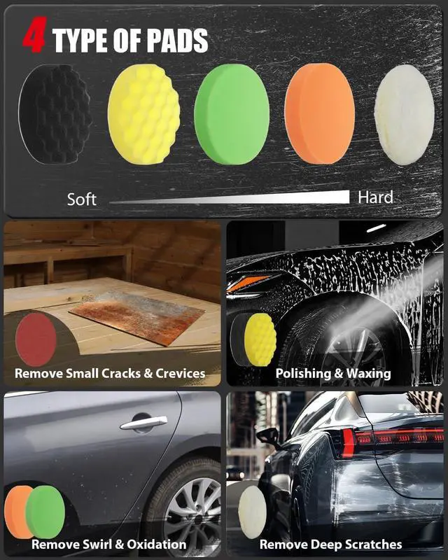Does all the job: AVID PIOWER Car buffers and polishers kit comes with sandpapers, fine and rough buffing pads for waxing, wool polishing pad. You can use different polishing pads to finish different applications, like polishing, removing swirls, scratches, and defects from all painted vehicles. You can also use it on boat, furniture, ceramic, wood, and metal. Whether you're a detailer or new to car polishing, this versatile rotary polisher will exceed your expectations