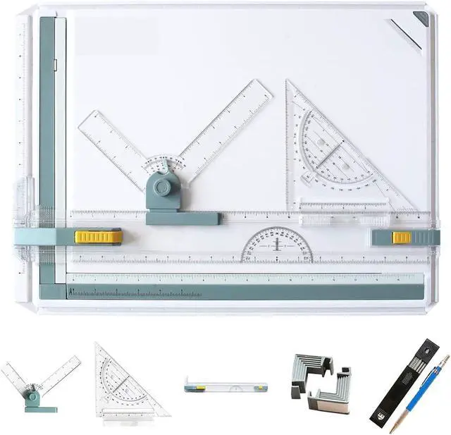 PACKAGE LIST: Set Square, 2x Clamps, 1x Protractor, 2 Anti Slip Support Legs, 1x Sliding Ruler, 1x drawing pencil and lead core, all parts in picture included! It will be a great Christmas gift for engineering students and people who draws a picture metrically.