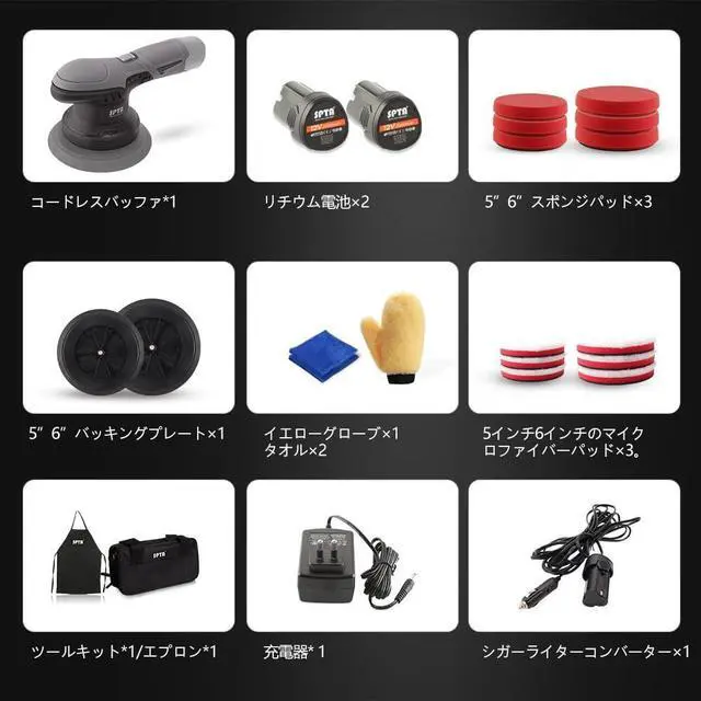 PACKAGE INCLUED: 1*wireless polishing machine, 2*12V 2.0A h lithium battery, 3*5&6" foam pads, 3*5&6" microfiber pads, 5&6" Backing Plate, Glove & Towels; Apron & Bag, Chrager & Lighter.