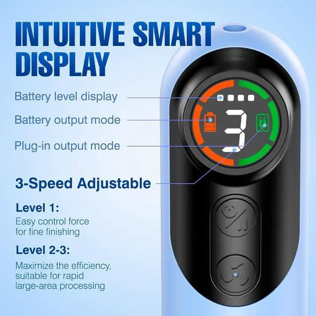 3-Speed Settings + LCD Screen: The power sander comes with 3 adjustable speeds, powered by a high-torque motor. Low speed for fine grinding, high speed for large-area sandingideal for different materials and tasks. The clear LCD screen displays speed, battery level, and power mode, keeping you in full control. Rigorously quality-tested, this orbital sander is durable and reliable, with a marine blue finish adding style to your workspace.