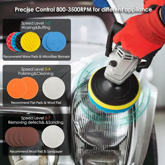 Variable Speed Control7 level variable speed from 800-3500RPM allows you to choose the suitable speed of car buffer according to different applications freely without stopping the car buffer. Low speed (1-2) is recommended for waxing and buffing; medium speed (3-4) recommended for polishing and cleaning; high speed (5-7) recommended for removing defects and oxidation. You can also adjust the buffer machine speed according to different materials to help you improve work efficiency.