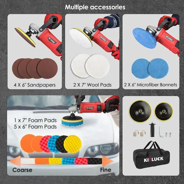 What You Get In Kit1 * Buffer Polisher Machine; 1* 7-inch Hook And Loop Base Pad; 1* 6-inch Hook And Loop Base Pad; 1* 7-inch Flat Foam pads 4* 6-inch Wave Foam pads; 1* 6-inch Flat Foam pads; 2* 7-inch Wool Polishing Bonnet; 4*sandpapers; 2* Microfiber Bonnets; 1* Anti-Vibration D-Handle; 1* Side Handle; 1* Thickened Tool Organizer Bag; 1* Hex Wrench; 2* Replaceable Carbon Brush; 1* User Manual.