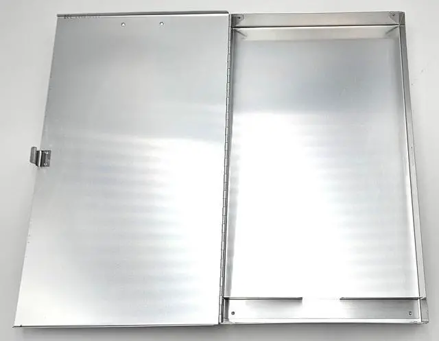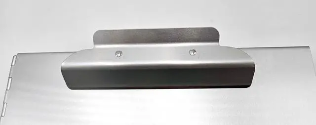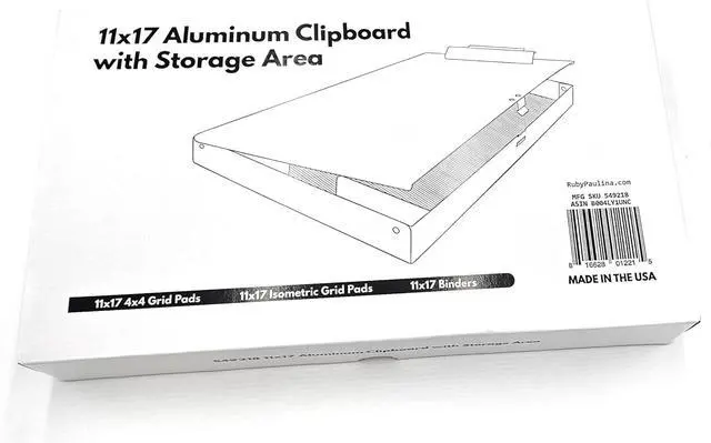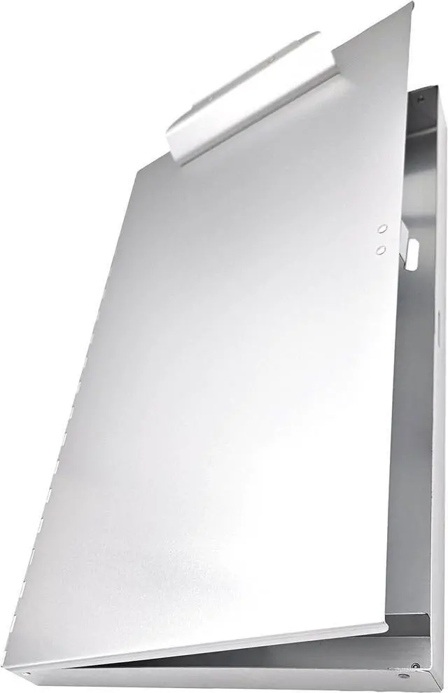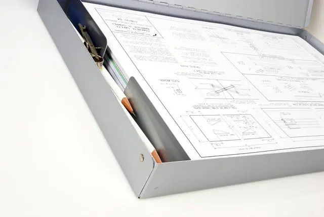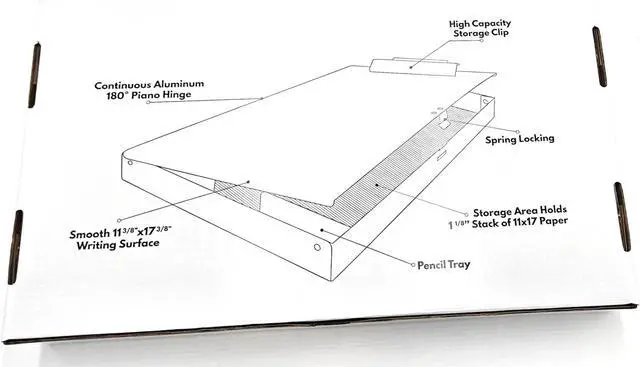 Our 11" x 17" aluminum clipboard with storage area from 11x17 is a storage box and clipboard in one. The innovative design includes a rectangular aluminum storage box with a pen/pencil holder. The clipboard is the lid, securing up to 1" of 11" x 17" drawings or documents. The high-capacity clip is centered near the edge of the shorter 11" side. All edges are rounded on our clipboards with built-in storage compartments.