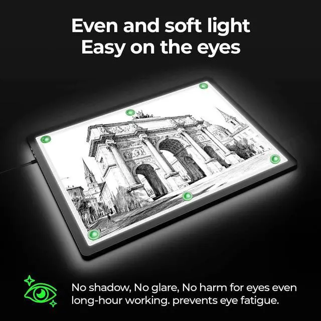 Eye-Care LED-- A2 light board is equipped with high-efficiency, flicker-free LED lights that provide consistent and even brightness across the entire surface. it ensures a crystal-clear view that reduces glare and minimizes eye strain. Whether you're working on detailed drawings, tracing designs, or inspecting intricate patterns, the light table creates a comfortable and well-lit workspace that supports long hours of use without fatigue.
