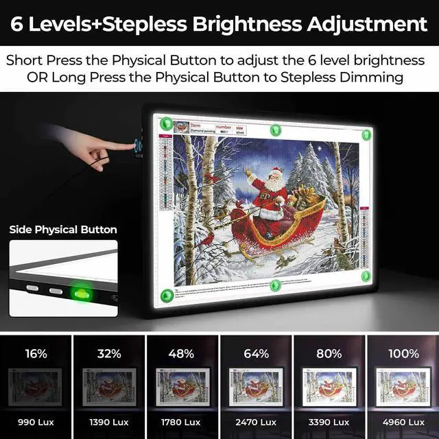 3 Color Temperatures and 6 Levels/Stepless Dimming-- A2 light pad for diamond painting have 3 color temperature (White, Warm, Mix Light) and and 6 Level brightness(990/1390/1780/2470/3390/4960Lux). Short Press the Physical Button to adjust the 6 brightness levels OR Long Press the Button to adjust the brightness Stepless. Memory function will let the led drawing board automatically turn on the brightness you used last time.