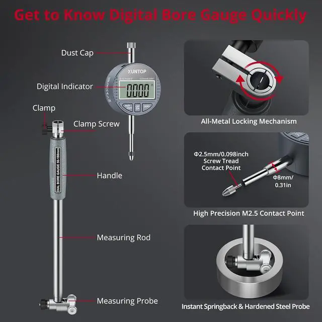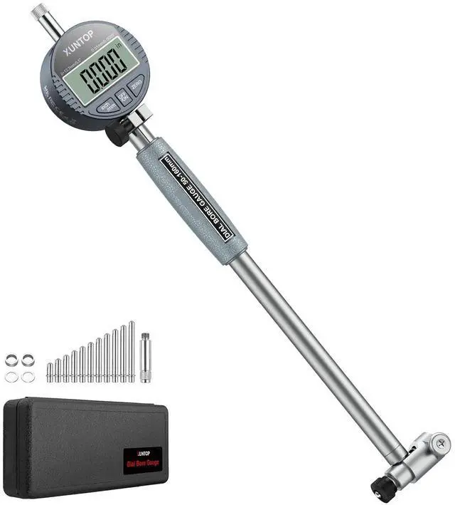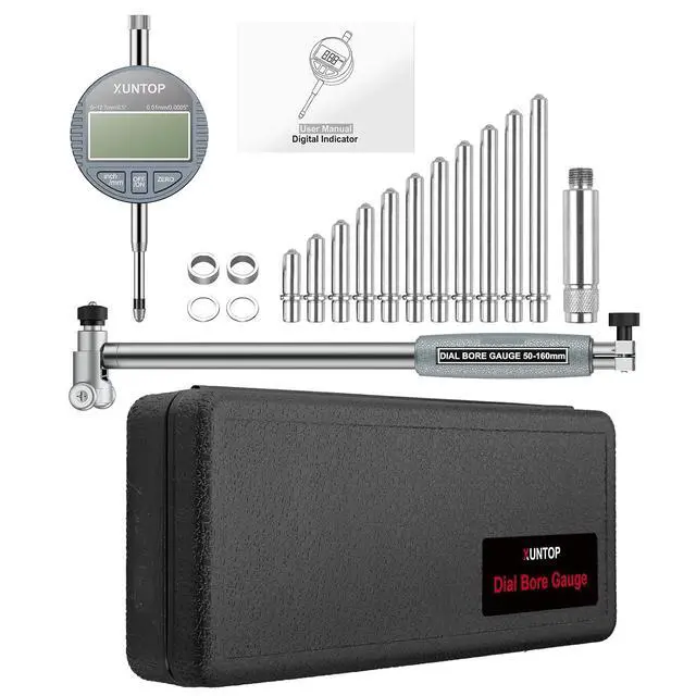 Package Includes: 1 x 0.5 inch digital dial indicator, 1 x a set of measuring accessories, 1xmeasuring rod, 1 x ABS case, 12 x different specification of gauge: 50mm, 55mm, 60mm, 65mm, 70mm, 75mm, 80mm, 85mm, 90mm, 95mm, 100mm, 105mm. Designed for engine cylinder, CNC, automotive, machining, and manufacturing, it adapts to diverse measurement tasks