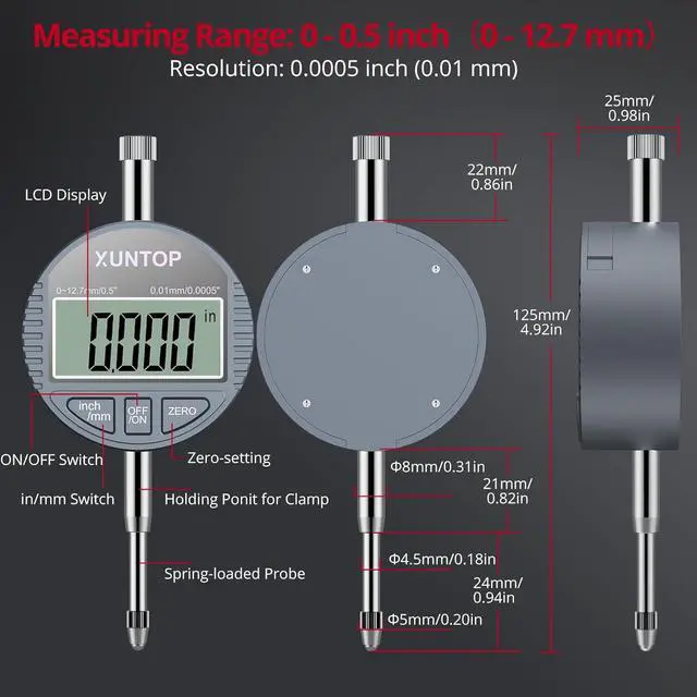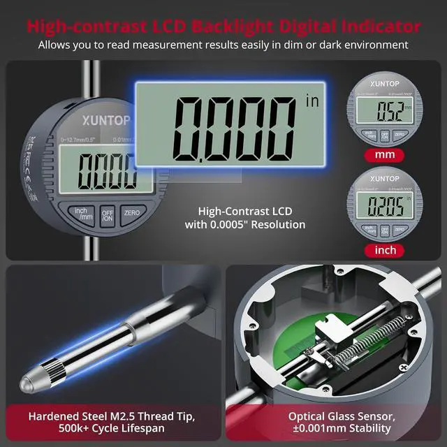 0.5" / 0.0005" Res Digital Indicator- Core PrecisionHigh-contrast backlight LCD ensures clear visibility in low light. Instant mm/inch conversion eliminates unit errors across standards. Zero-setting function allows recalibration at any position in 1 second - no manual adjustments needed. Reduces operator fatigue during repetitive measurements.
