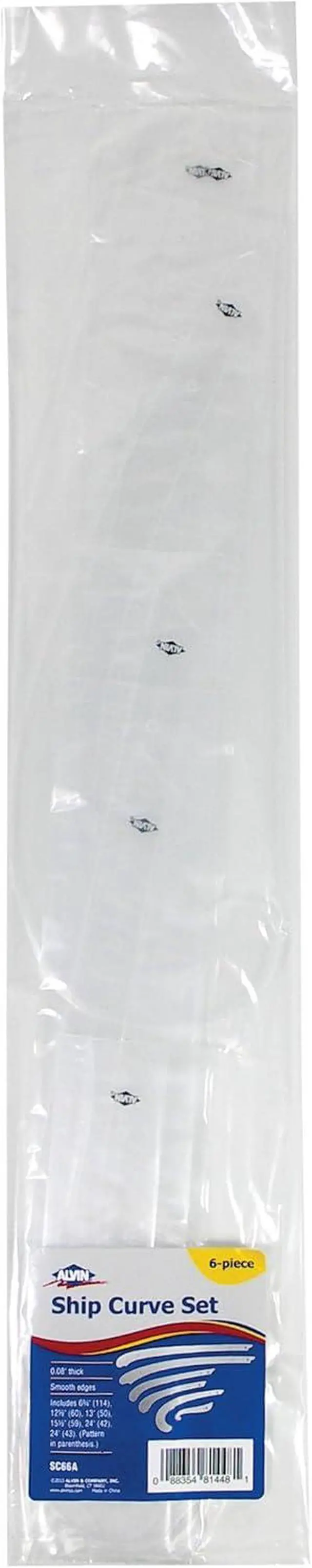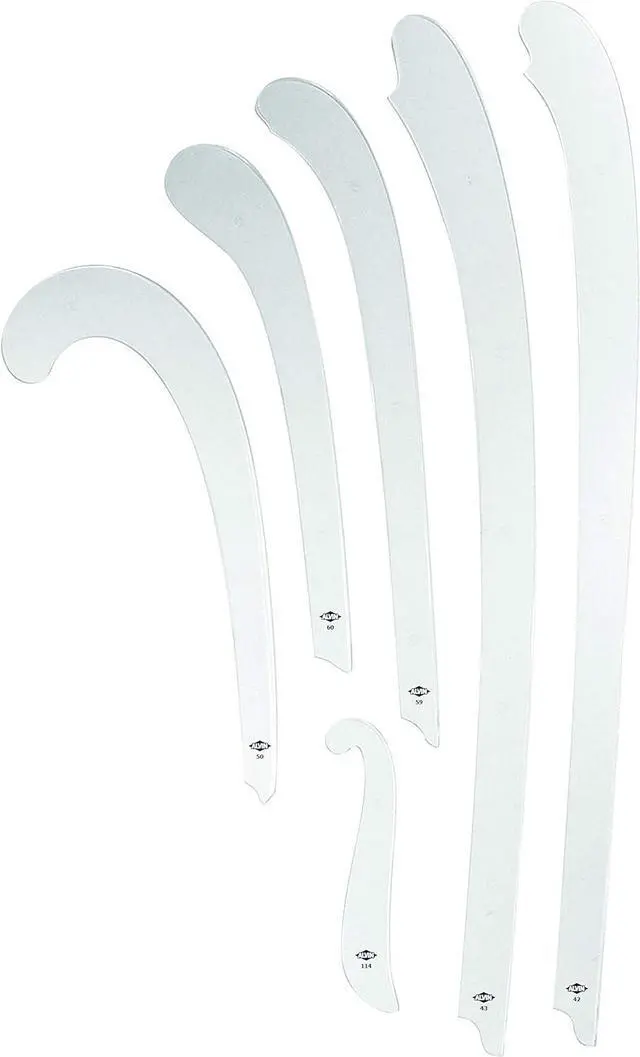 Set of 6 ship curves fabricated from clear acrylic with smooth edges. Sizes include 6 3/4 inches (114), 12 1/2 inches (60), 13 inches (50), 15 1/2 inches (59), 24 inches (42), 24 inches (43). (Pattern number in parenthesis). Plastic thickness is 0.08 inch. has been the professional's choice for drafting tools and drawing supplies for over half a century. Since 1950, we have brought quality and value to our customers. Our tools help bridge the gap between ideas and innovations. We are known for our wide selection of high quality tools at a fair price.