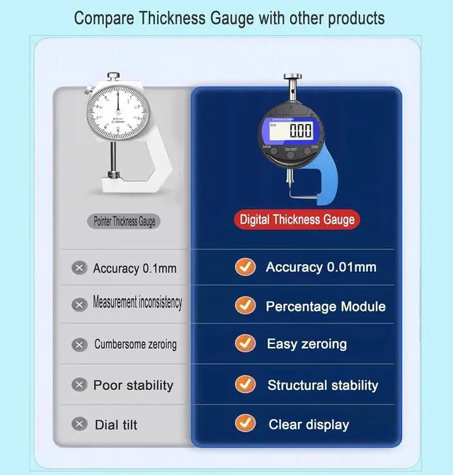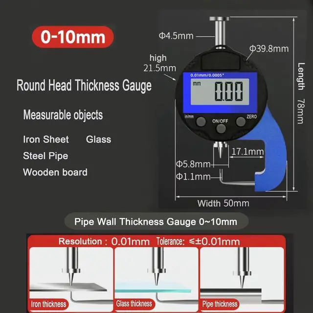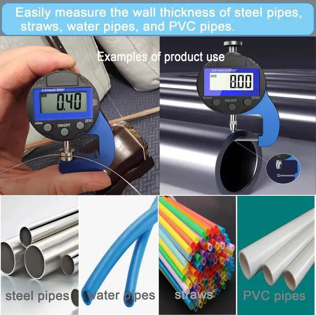 Wide Range Of ApplicationsDigital thickness gauge is suitable for lathe, workshop, CNC machine tools, can measure hollow tube, round tube wall thickness, concave and convex products, also can measure hard flat surface, need to gently press the elbow model