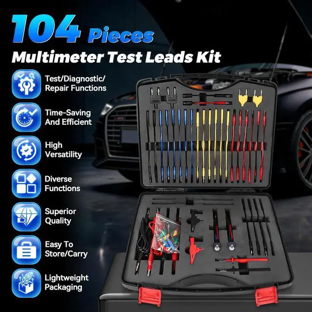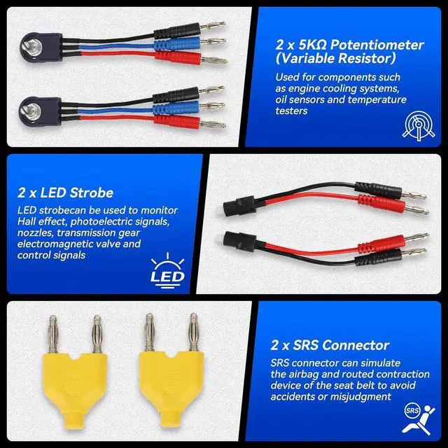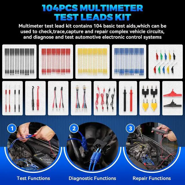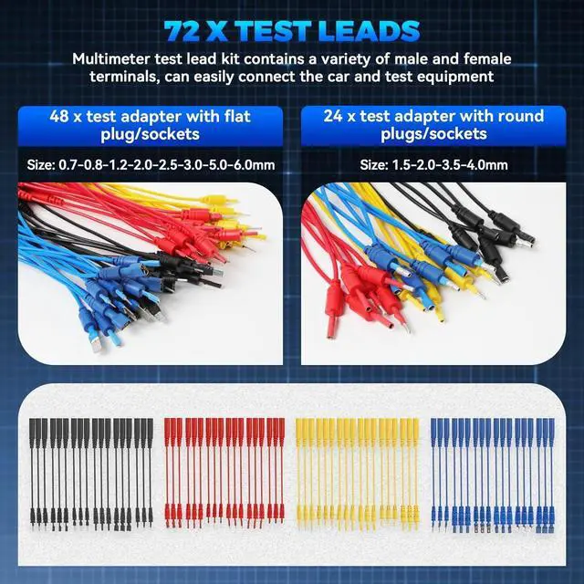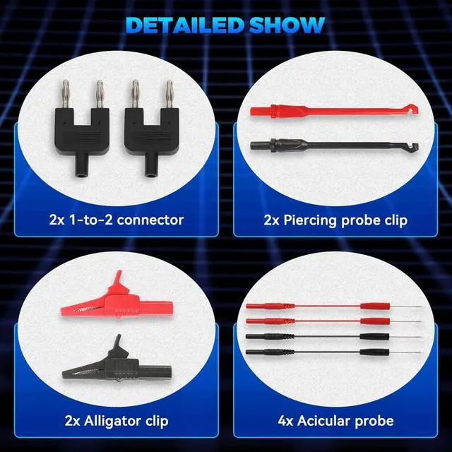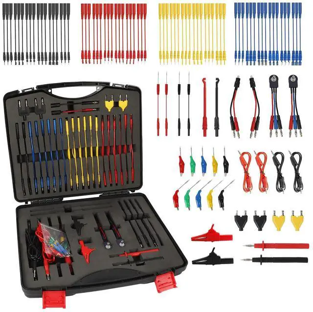 What You Can GetTerminals x72 (48 flat terminals and 24 round terminals); SRS Connector x2; 1-to-2 Connector x2; Alligator Clip x2; LED Stroboscope x2; Standard Probe x2; Acicular Probe x4; Potentiometer (5KOhm) x2; 1-to-1 Connector x4; Piercing Probe x2; Straight Back Probe x5; 45° Back Probe x5; Black carrying case.