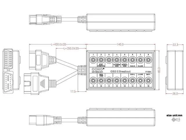3, OBD-II breakout header cable length 420mm (16 inch), to facilitate plugging in equipment.