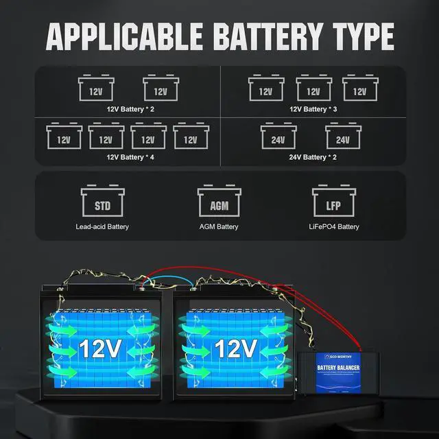 Equalizer: Equipped with reverse polarity protection, safeguarding against short-circuit damage from accidental positive and negative pole confusion; Rapidly balances voltage and capacity differences, extending battery life