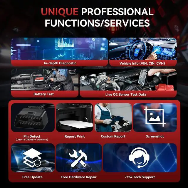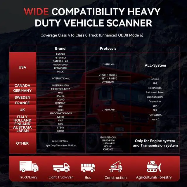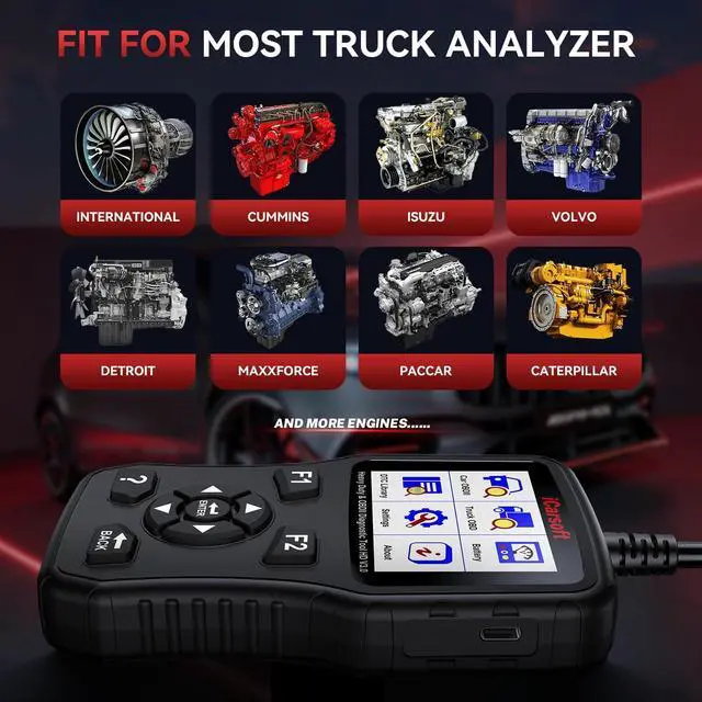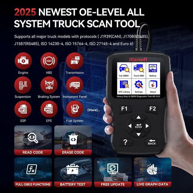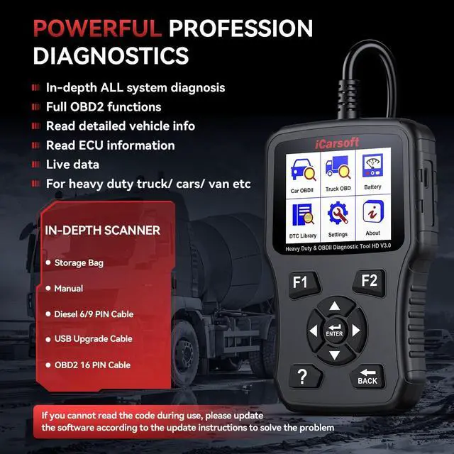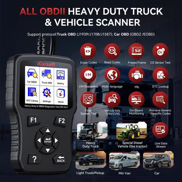 Enhanced 2-IN-1 Scanner for Trucks & Cars HD V 3.0 Black OBD Scanner do full OBD diagnostic for trucks and cars. Such as Read & erase codes, EVAP system test, On-board monitoring, retrieves vehicle information, I/M readiness, freeze frames, O2 sensor test and DTCs.