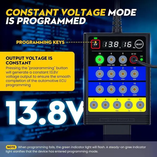 • Constant Voltage The upgraded breakout box comes with Constant Voltage Mode Programming, where pressing the CV button produces a constant 13.8V voltage output to ensure smooth automotive ECU programming.
