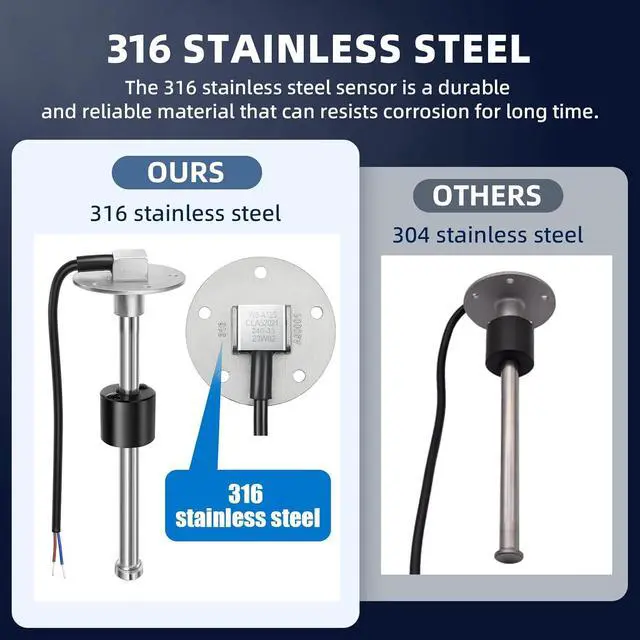 Stainless Steel: 316 stainless steel contains molybdenum, making it resistance to chloride corrosion than 304. Our 316 Stainless Steel Fuel Sending Unit more suitable for tough and corrosive environments. The 304 Fuel Sender more likely to develop rust over time, compromising its structural integrity