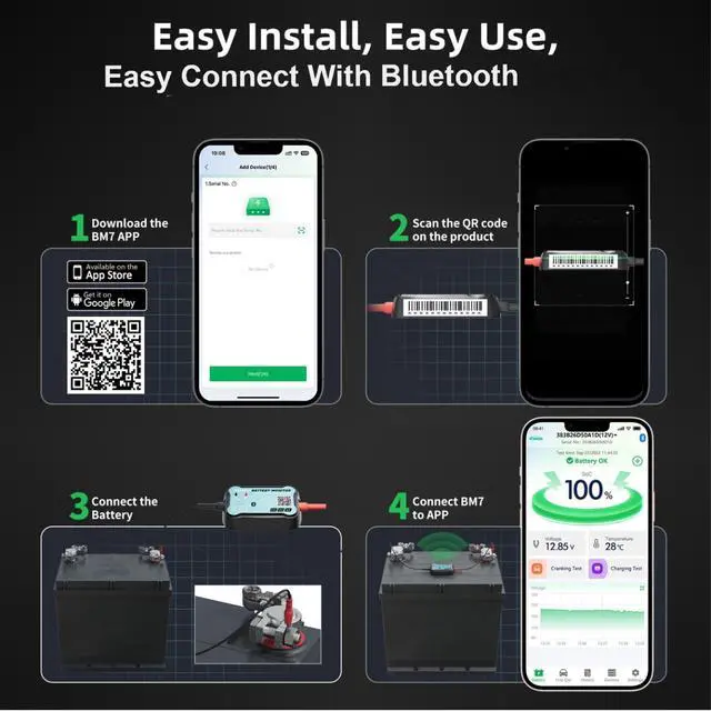 EASY TO USE: Install once to permanently fix onto the battery, no need to re-install. Access batterys health data directly from your phone and enjoy real-time monitoring by opening the app. Additionally, the power consumption is almost negligible at 1mA, so you don't have to worry about the BM7 draining the battery by being connected to it all the time (the App can monitor up to 4 devices at the same time). With Bluetooth 5.3, the APP automatically connects to the monitor within 10 meters, allowing you to comfortably monitor real-time battery data for proactive intervention.