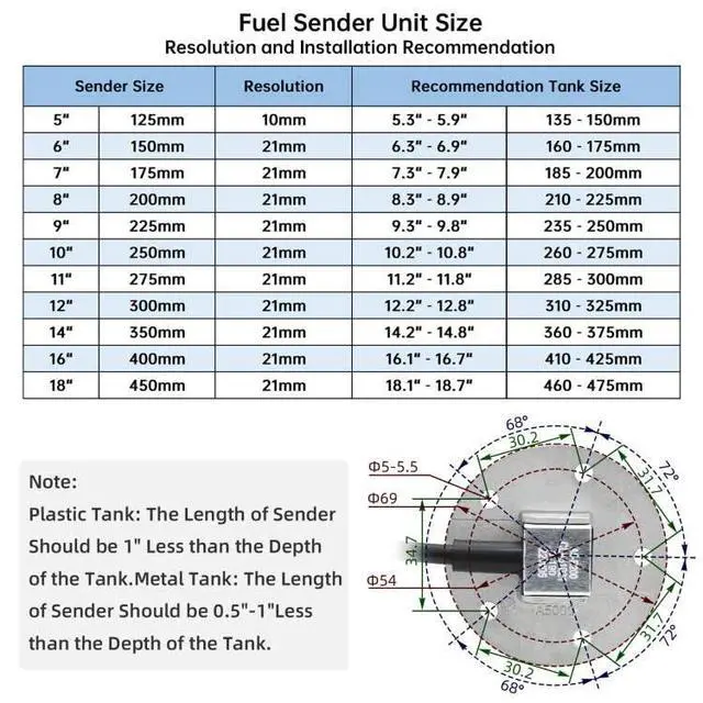 [Noted]: Avoid the sensor to hit the bottom of the tank, the length of the sender should be 1" (25mm) less than the depth of the fuel tank