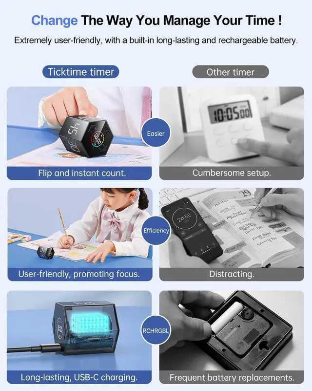 Important charging & usage guidelines: This cube timer should not be used while charging, and it is not waterproof. For initial use, please charge it for 12 hours, and for subsequent uses, charge it for 4 hours. Once the charging is complete, unplug the charging cable and simply press any button to activate the timer.