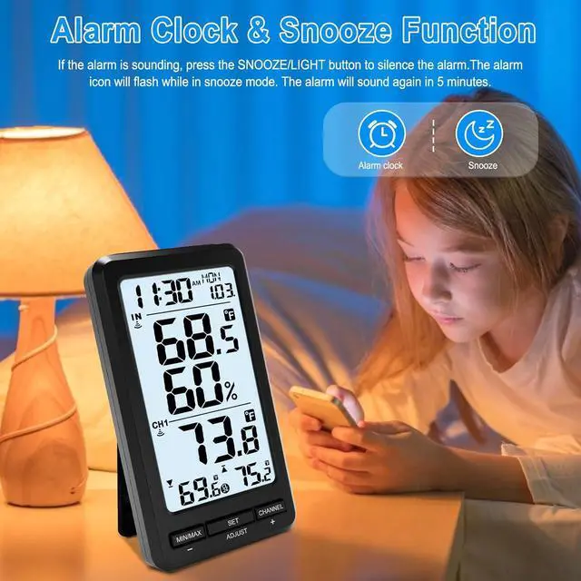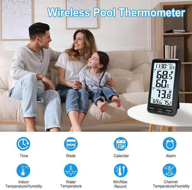 Multifunctional Pool ThermometerThis pool thermometer with memory function can record the min/max temperature humidity, indoor/pool temperature(/switch oppional) and snooze function. This pool thermometer can set clock alarm, also can set water temperature High /Low alarm
