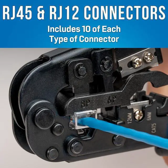This kit provides all the necessary tools for cutting, crimping, punching, and terminating network and telephone cables.