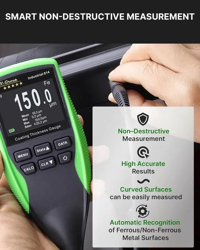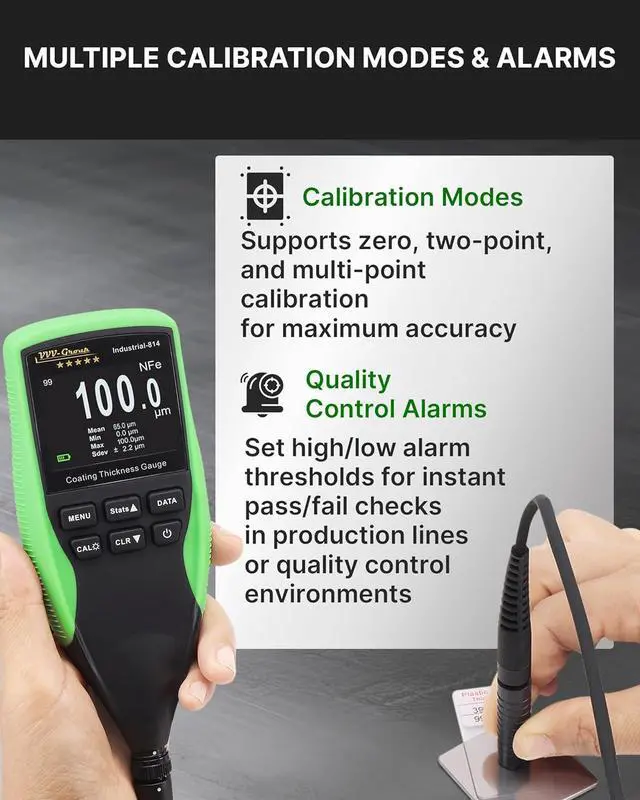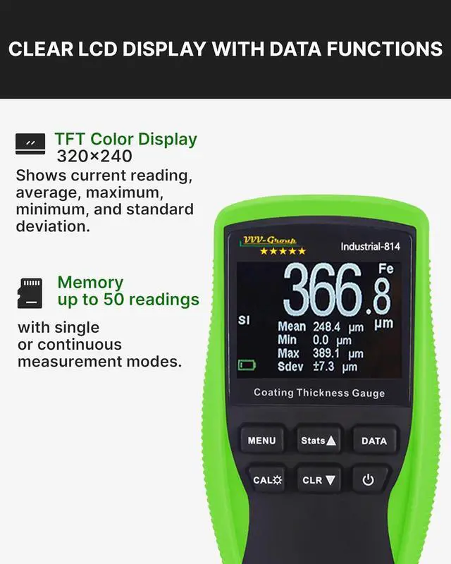 CLEAR COLOR DISPLAY FOR FIELD WORK - High-contrast 320×240 TFT display shows coating thickness, substrate type and statistics clearly, improving readability in workshops, inspection sites and industrial environments.