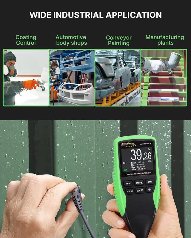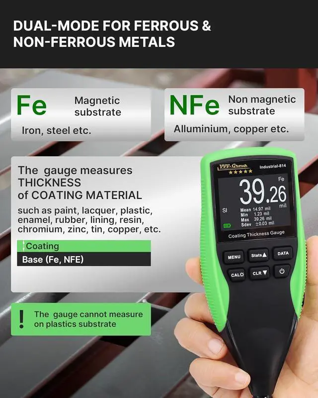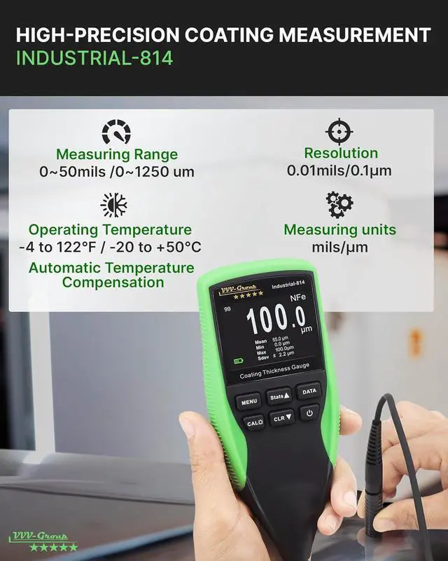 BUILT-IN STATISTICS FOR QUALITY CONTROL - Displays current value, average, minimum, maximum and standard deviation, allowing inspectors to quickly evaluate coating consistency and identify coating defects during production checks.