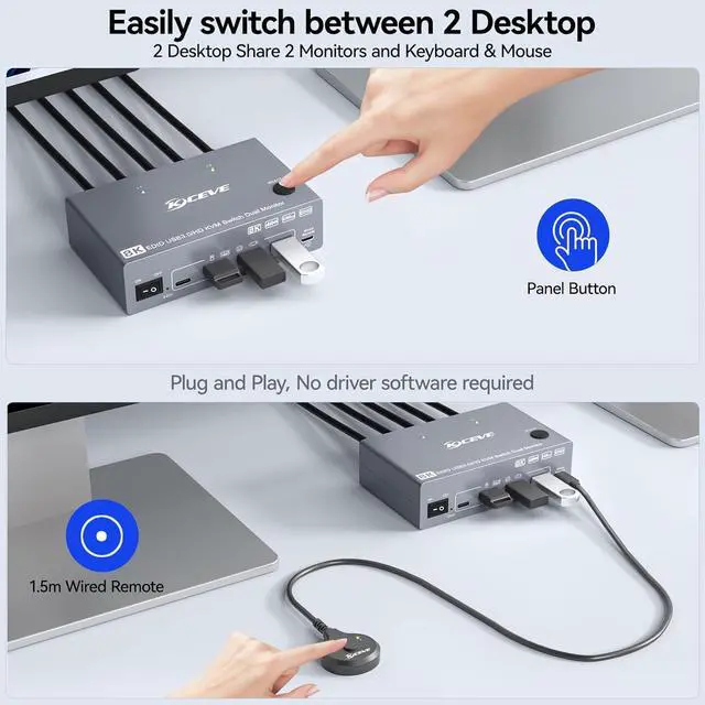 Seamless Switching with Wired Remote & Button Control Easily switch between 2 computers using the panel button or the included 1.5 m wired remote. LED indicators show which computer is active. Plug and playno drivers needed. KVM 2 monitors 2 computers includes an ON/OFF switch to turn off displays without shutting down PCs.
