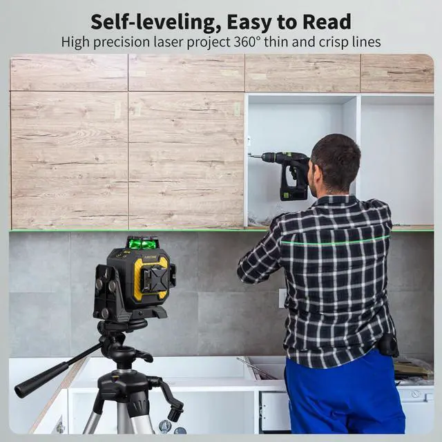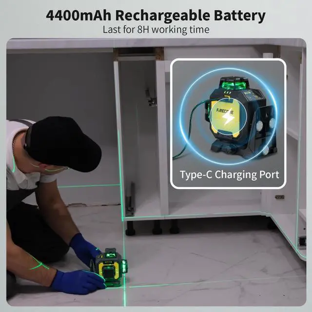EXTENDED RUNTIMEThis 360 laser level equipped with a built-in 4400mAh rechargeable Li-ion battery, providing over 8 hours of continuous runtime, 3 battery indicators on the battery allow users to know the current battery volume, assures an uninterrupted workflow of any layout tasks. To further increase the operating time, the laser line strength is adjustable (100/75/50 percent) which has the added benefit of thinner laser lines