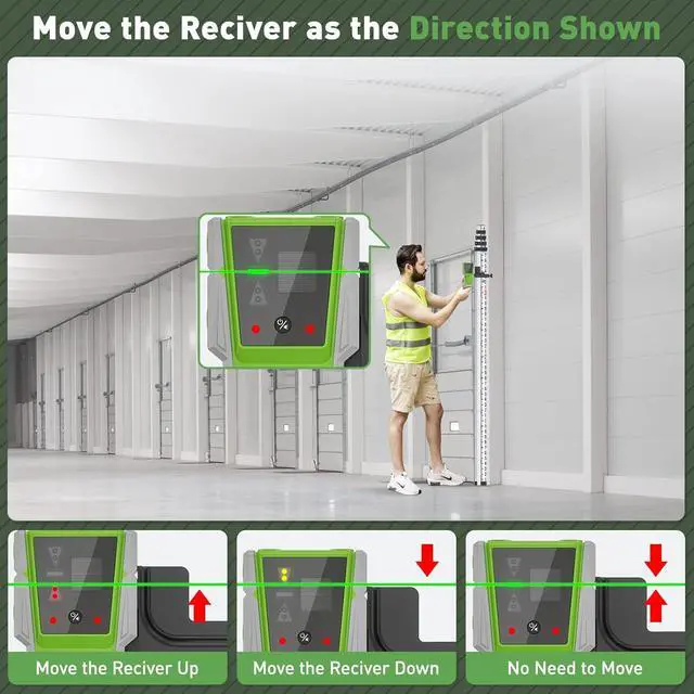 Clear Multi-sided Readouts and Bubble: The laser receiver has instructions on both the front and back to make it easier to read the values and check the position easily. It is also equipped with a double-sided bubble vial to quickly determine the horizontal position