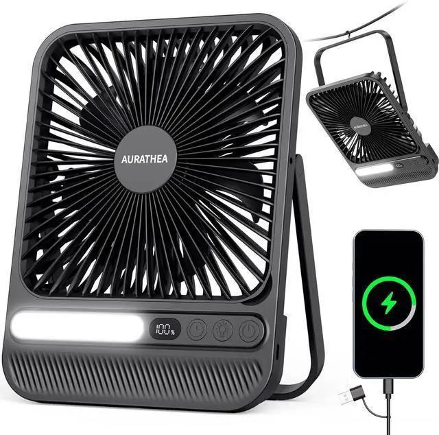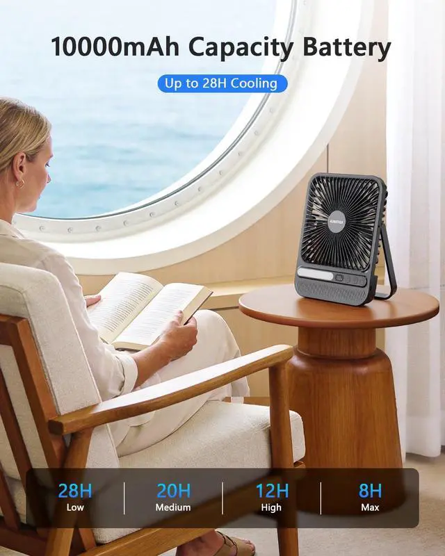 LED Light & Hook DesignThe Camping Fan features a LED light with 3 adjustable brightness levels, making it suitable for both bedroom and camping lighting use. The 180° adjustable handle bracket allows flexible positioning, while the hook on handle makes it easy to hang from tents or other gear.