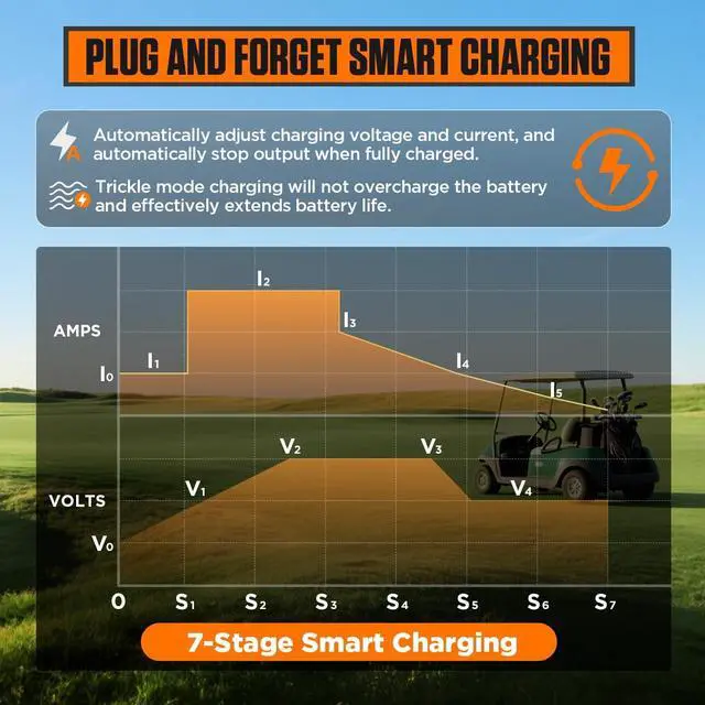 7-Stage Smart Charging with Built-In Cooling FanAdvanced 7-stage charging logic precisely controls voltage and current throughout the charging cycle. A built-in cooling fan efficiently dissipates heat, while the 15-hour safety timer prevents extended overcharging.
