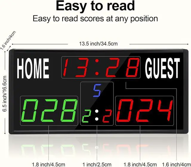 With 120power cord & support for mobile power--The electronic scoreboard with timer can support mobile power supply (not included), allowing you to carry it anywhere for use at any time. LED scoreboard come with a 120-inch power cord.