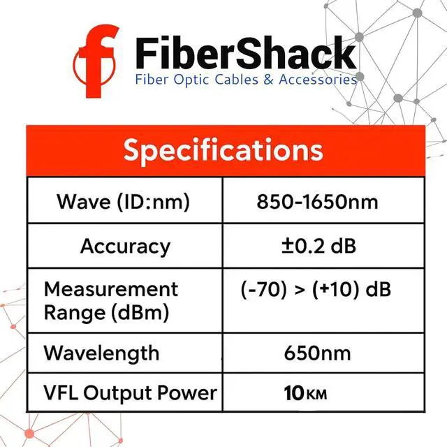 Specs - Our fiber optic tester tests Wavelengths 850 to1650nm. Test range is -70dBm~+10dBm. Measurement error is less than ± 0.2 dB. Easy zero user Calibration button. Continous or Glint functions. English Instructions. Uses 2x AA Batteries (NOT INCLUDED)