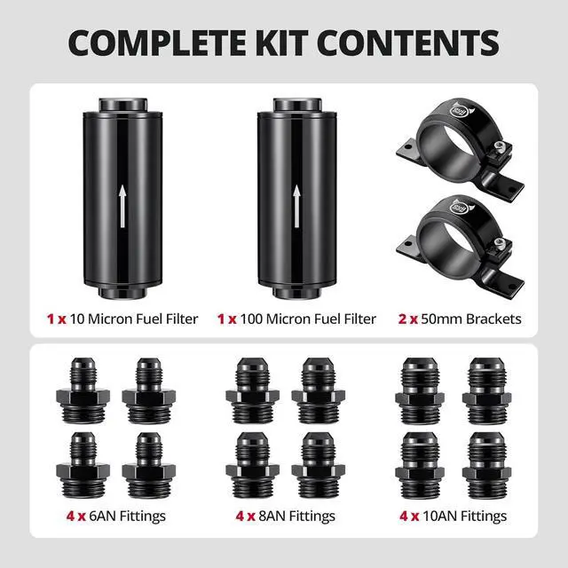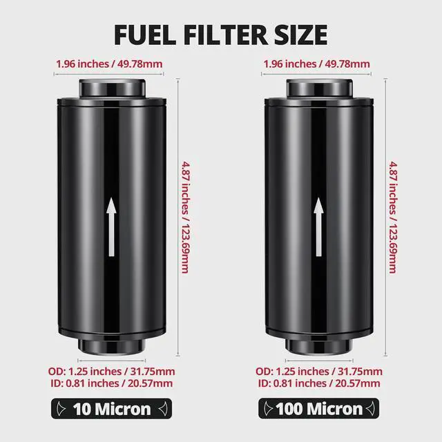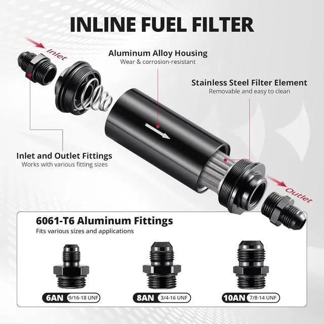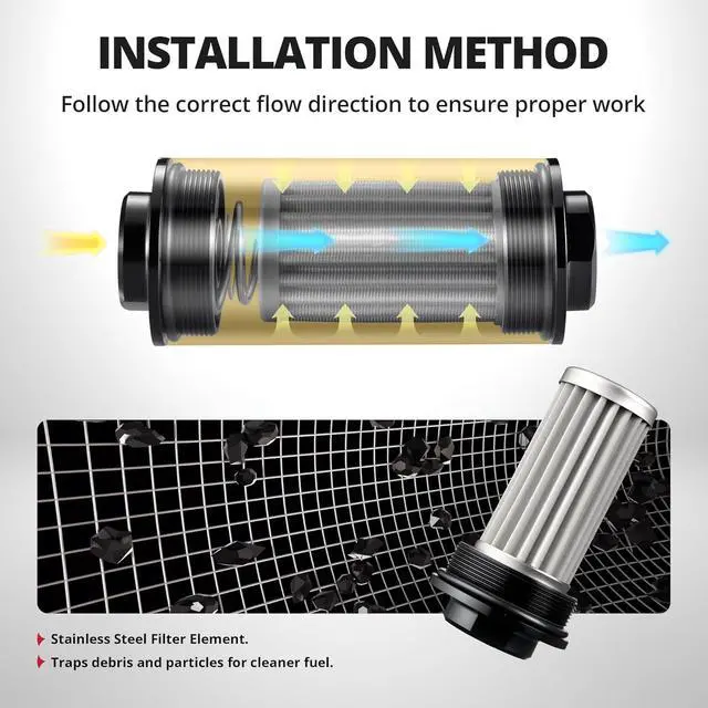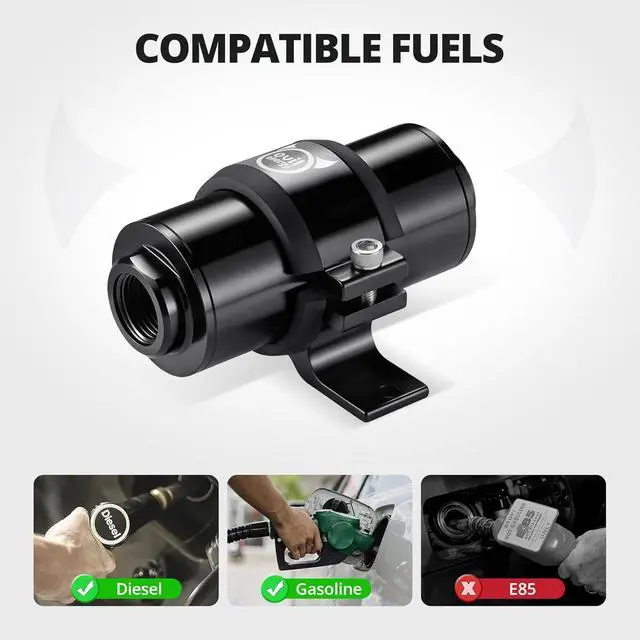 FUEL COMPATIBILITY: The aluminum inline fuel filter with a stainless steel element is suitable for gasoline, diesel, and other commonly used fuels (Not compatible with E85), helping protect fuel systems from impurities.