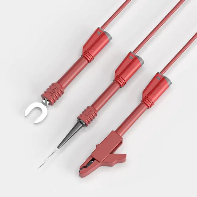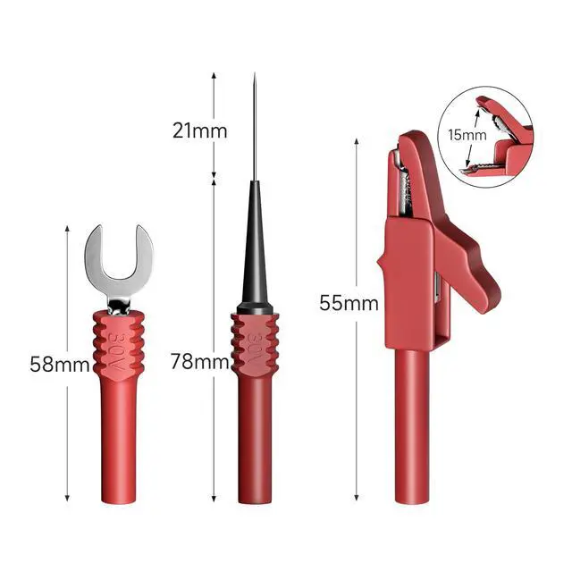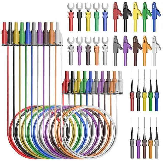 Package include: 10PCS 4mm stackable banana plug silicone test leads, 10PCS alligator crocodile clips, 10PCS spade plugs, 10PCS back probes.