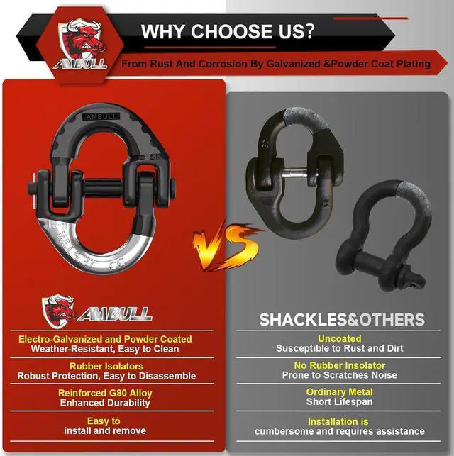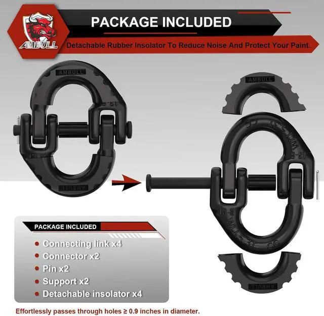 PACKAGE: The 2-pack tow chains connector include everything you need, Connecting link x4; Connector x2; Drive pin x2; Detachable insolator x4. The exquisite packaging protects the product well, you can also give it as a gift to your friends.