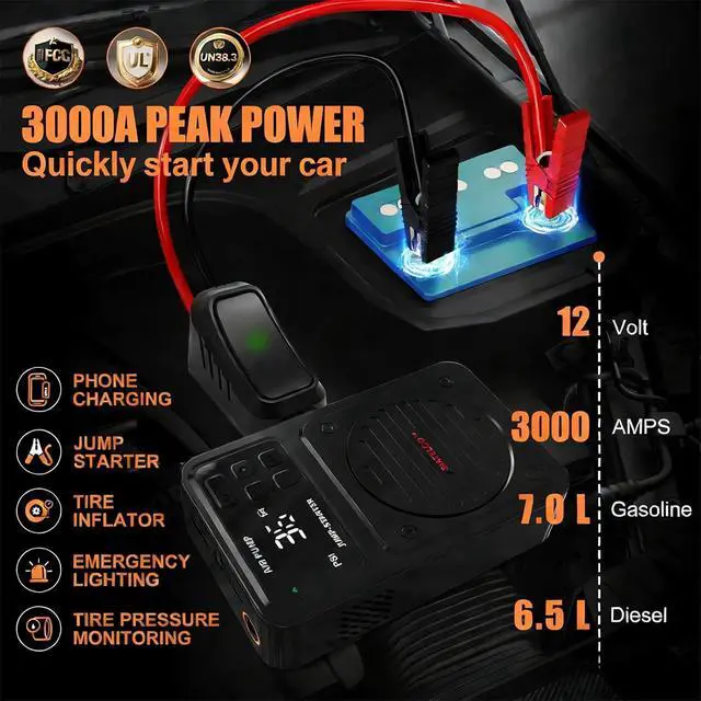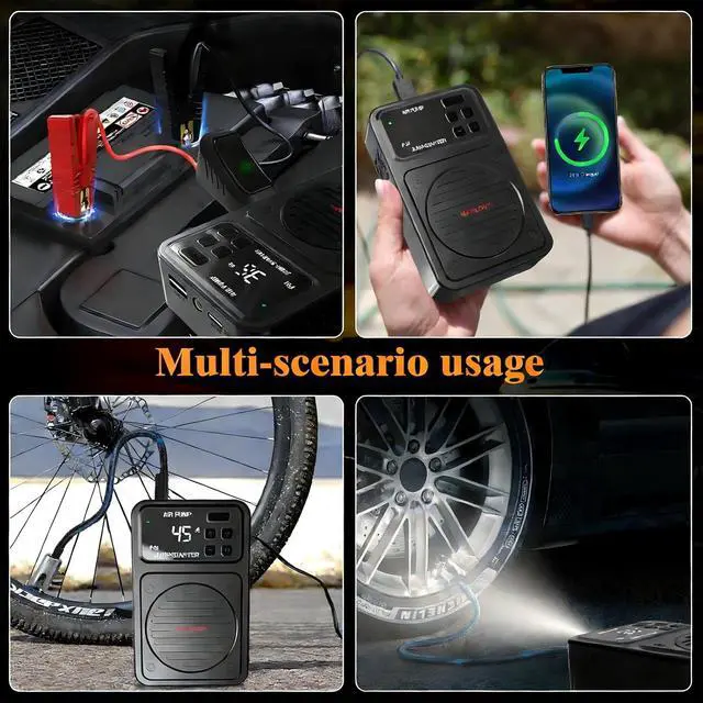 5. All-in-One Emergency Tool-This portable car jump starter with air compressor combines jump starter, tire inflator, power bank, and LED flashlight with SOS mode. Perfect for roadside emergencies, long-distance travel, camping, truck use, motorcycle trips, and daily driving situations