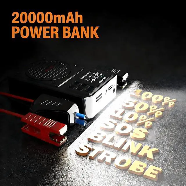 3. Long-Lasting 20000mAh Power Pack-High-capacity 20000mAh lithium battery provides multiple jump starts per charge. Functions as a portable 12V car battery charger, jump pack, and power bank for phones and small devices. Low self-discharge ensures long-term readiness as an emergency jump starter battery pack