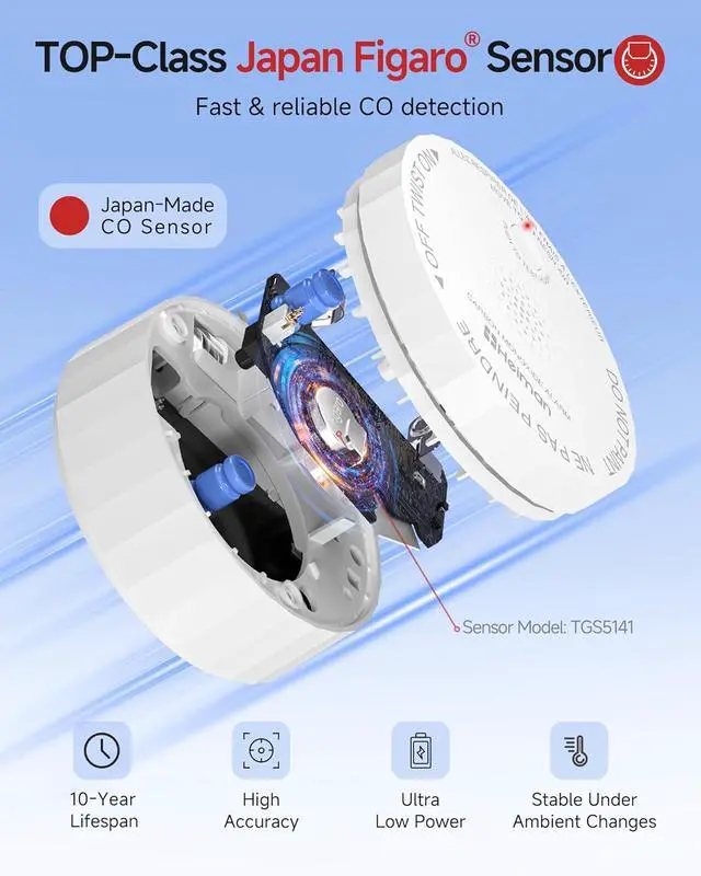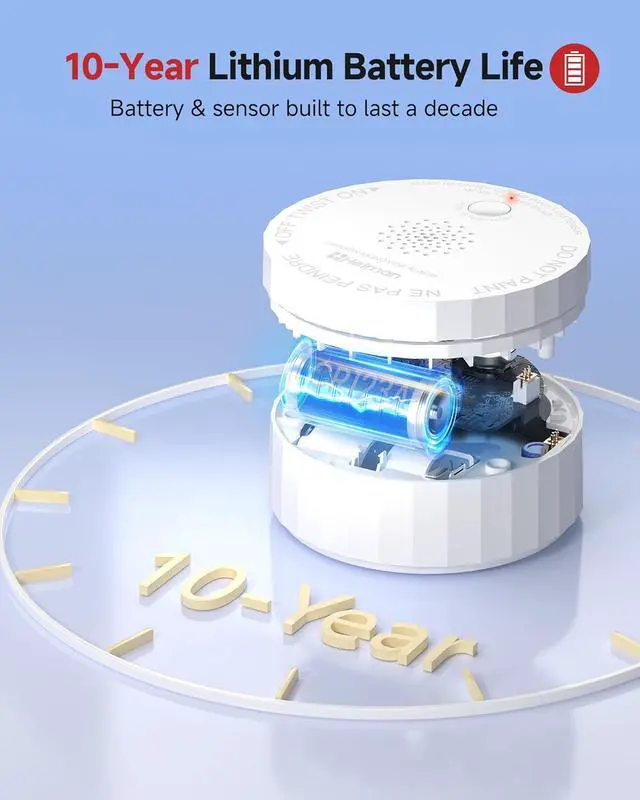 10-Year Battery & Fire-Resistant Housing Powered by a 10-year lithium battery (included), this CO detector delivers continuous protection even during power outages with no wiring required. Its flame-retardant ABS+PC housing (UL94 V-0 rated) resists high temperatures and corrosion, helping it withstand heat and slow fire spread for long-term safety.