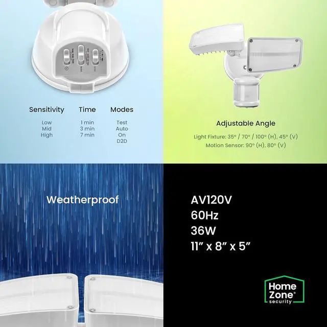 ADJUSTABLE SETTINGS: Easy to control dials to adjust motion sensitivity, timer, and select between test mode, auto (dual brightness mode), continuous on mode, and dusk to dawn mode
