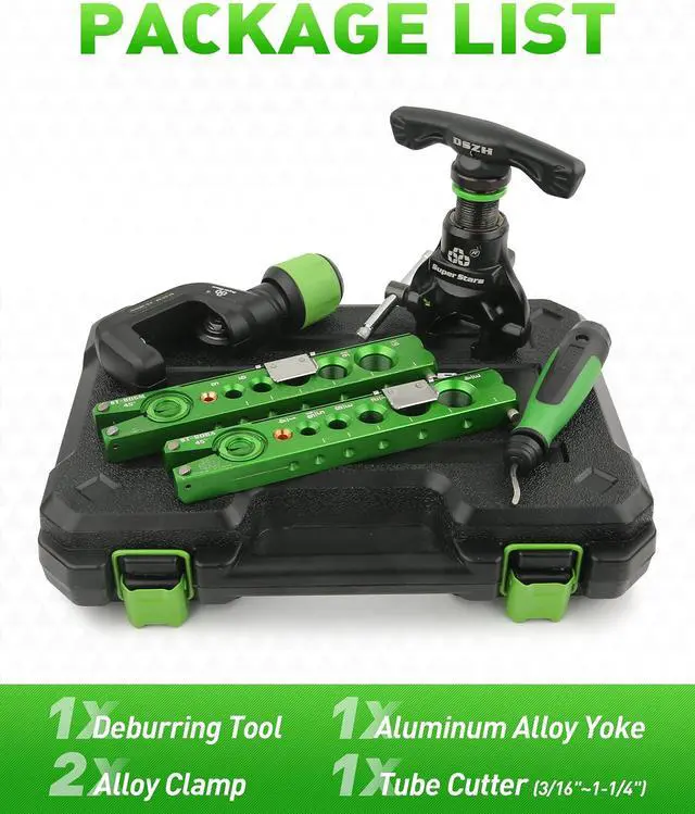 All In One Kit: The flare tool set includes 1 flaring tool, Metric and Inch clamps, cutter and deburr. Highly dependable, economical choice for refrigeration, heating air and other industrial markets