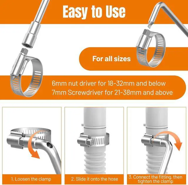 Easy to Use: It comes with a dedicated socket spanner and screwdriver for all installation needs. To install, simply use a screwdriver to tighten or loosen the clamp screw, adjust to the desired size, and securely fasten the stainless steel hose clamps in place.