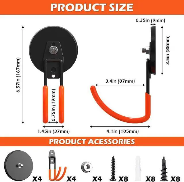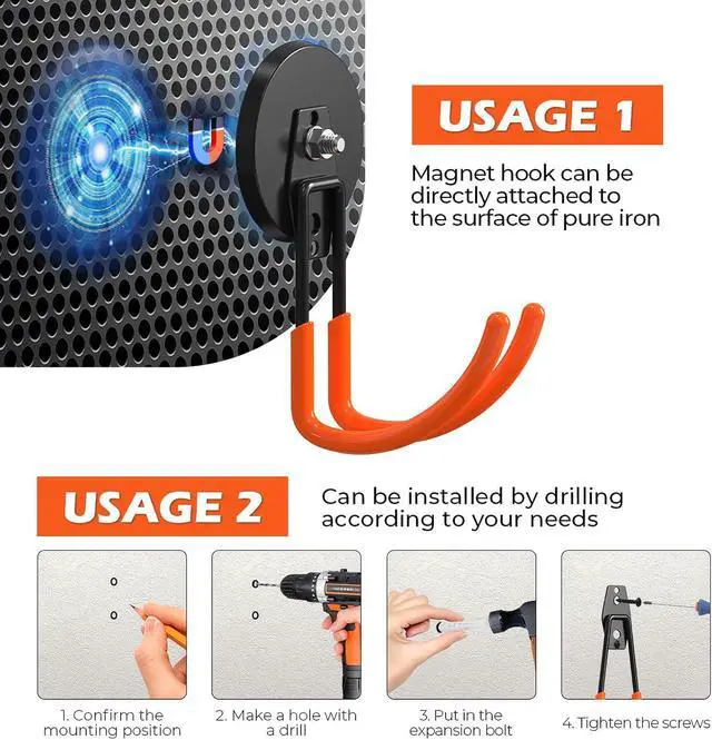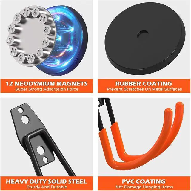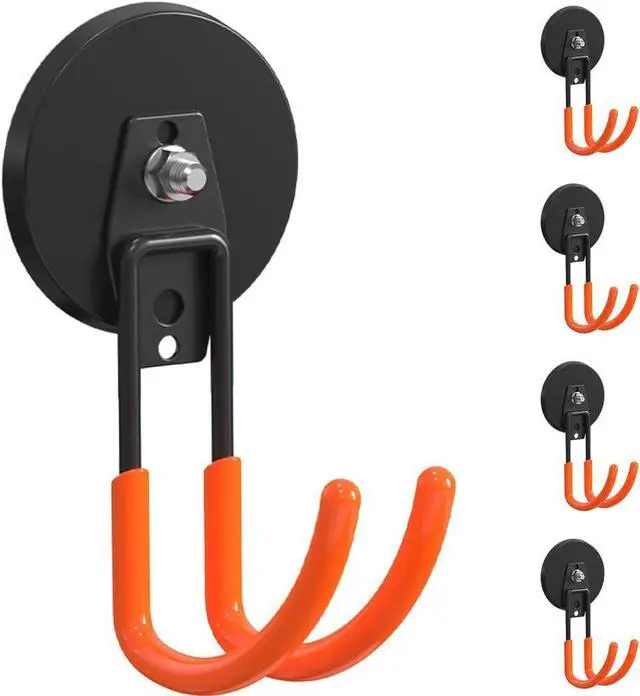 [UPGRADE 2: Biger J Hooks] Industrial magnet hooks are made of heavy duty solid steel with double big J hooks design. Compared to other brands of the same type of magnetic double hooks, our strong heavy duty magnetic hooks are longer and larger in size, so you can hang bigger and more items. Orange rubber has been coating to the hook section, providing more grip and protecting any hanging objects from scratches.