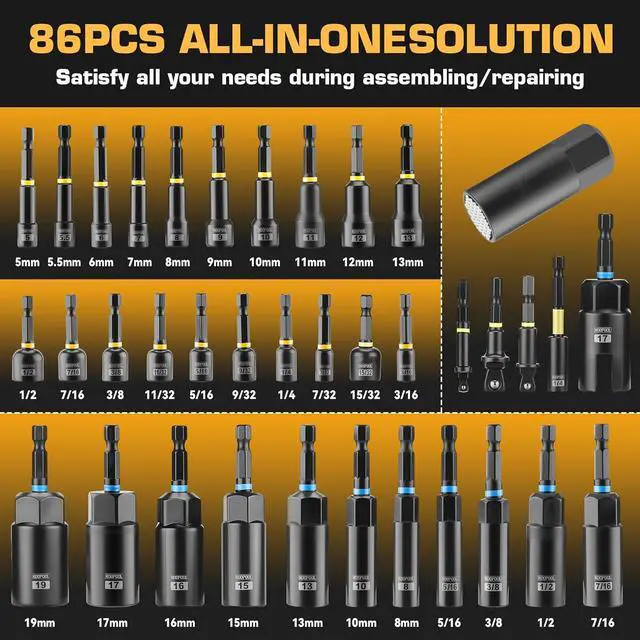 THE COMPLETE ARSENAL: Conquer any task with this comprehensive collection. It includes a full range of Metric (mm) and SAE (inch) nut drivers, alongside essential socket adapters, impact extensions, a universal joint, and a dedicated wing nut driver