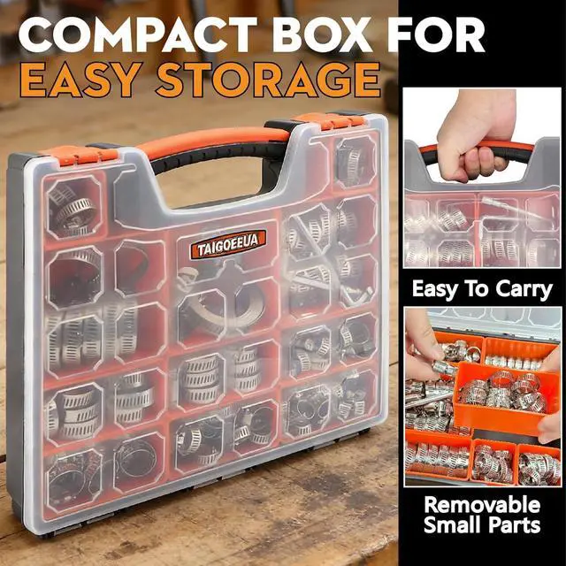 Product design: The diameter of hose clamps are marked on band surface for quickly identification and find hose clamps. The worm gear transmission mechanism is firmly clamped, with strong locking force and torque performance, avoid the risk of detachment, and have smooth edges that do not damage the hose. Each type of clamp is stored separately in a small box in a portable suitcase for easy storage and carrying.