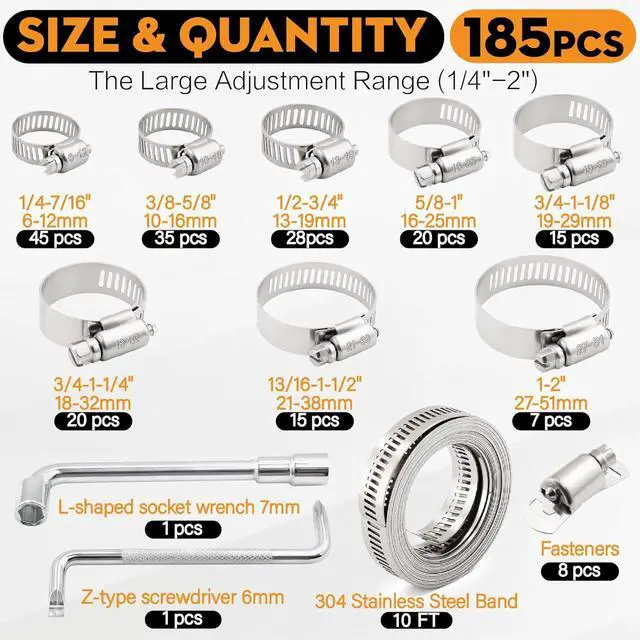 185PCS Worm Gear Hose Clamps 1/4"-2"(6-51mm) 304 Stainless Steel Assortment and 10FT Heavy Duty Metal Strap with 8 Stronger Fasteners Adjustable DIY Kit with Two Matching Tools